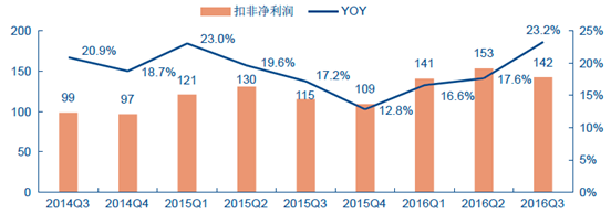 2016Q3醫藥行業扣非凈利潤達142億元,同比增長23.2%,增速較2016Q2環比提升5.6pcts,較2015Q3同比增長6.1pcts,且顯著高于收入增速,企業盈利能力不斷提升。