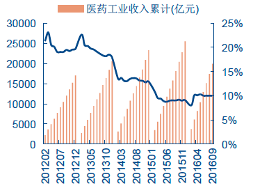 從行業增速角度,2016 年1-9 月基本延續了前期行情,利潤端增速(13.90%)仍然高于收入端(10.00%),反映了微觀層面企業經營的持續改善,我們判斷醫藥制造業2016 年全年有望保持10%-15%左右的增長。2016 年國內針對醫藥工業、醫藥流通、醫保支付及終端醫療服務進行了多項改革,健康中國2030 規劃的推出更是為醫藥產業的發展提供了綱領性的指導,淘汰落后產能、并購整合、騰籠換鳥等已經成為長期趨勢,未來只有積極求變且變革方向符合產業趨勢的企業才能獲得長期增長。