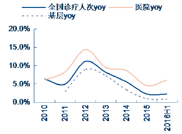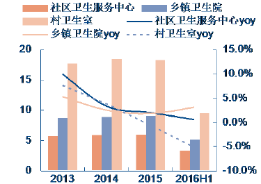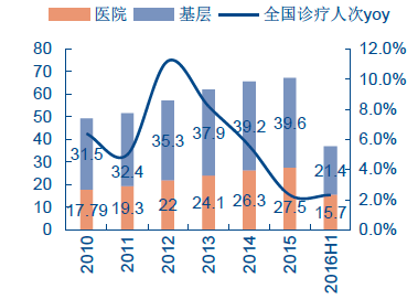 2016H1全國醫療衛生機構總診療人次數達到38.5億,同比增長2.3%,其中醫院診療人次數15.7億,占比40.8%,同比增長6.1%,基層醫療機構診療人次數21.4億,占比55.6%,同比增長0.6%,這與65%的基層診療量指標仍有較大差距。