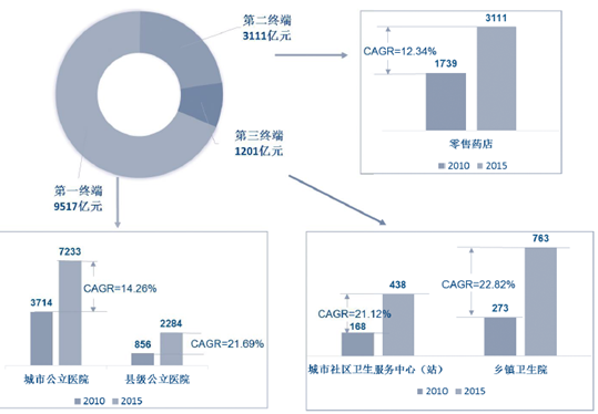 類別2013201420152016H1全國診療人次(億)64.167.769.338.5全國診療人次yoy8.2%5.6%2.3%2.3%醫院診療人次(億)24.126.327.515.7醫院yoy9.5%8.7%4.6%6.1%公立醫院21.723.524.413.8公立醫院yoy8.9%8.2%3.9%4.6%民營醫院2.42.83.01.9民營醫院yoy15.6%13.3%10.1%18.5%基層診療人次(億)37.939.239.621.4基層yoy7.3%3.4%1.0%0.9%社區衛生服務中心5.75.963.3社區衛生服務中心yoy9.9%3.3%2.0%0.5%鄉鎮衛生院8.78.995.1鄉鎮衛生院yoy5.3%2.5%1.8%3.1%村衛生室17.718.418.39.5村衛生室yoy7.6%3.8%-0.6%-5.2%其他醫療機構診療人次(億)2.12.22.21.42010至2015年我國藥品終端銷售規模由6,750億元增長至13,829億元,對應5年復合增速15.42%。公立醫院(占比69%)、零售藥店(占比22%)及公立基層醫療機構(占比9%)是我國藥品銷售的三大主要終端,其中公立醫院2015年藥品銷售規模約9,517億元,同比增長10.71%。零售藥店藥品銷售規模約3,111億元,同比增長10.01%,公立基層醫療機構藥品銷售規模約1,201億元,同比增長16.26%,三大終端2010-2015年復合增長率分別為15.80%、12.34%和22.19%。公立基層醫療機構因體量小、政策導向等因素,增速顯著高于第一和第二終端。