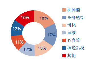 2016H1 南方所樣本醫院終端化藥銷售規模635 億元,同比增長11.08%,其中腫瘤、抗感染、消化及代謝為前三大品種,銷售規模分別占比17.98%、16.65%和14.63%,神經、腫瘤及血液同比增速較快,分別為17.17%、12.03%及11.26%。