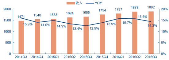 類別201120122013201420152016H12011整體規模20325428831632516412.43%心腦血管疾病用藥74911021101125710.85%腫瘤疾病用藥31394651542715.03%呼吸系統疾病用藥22303539392115.24%骨骼肌肉系統疾病用藥1923242626128.80%消化系統疾病用藥13151819211013.45%婦科用藥1114151717811.38%其他34424853562913.33%2016Q3醫藥行業收入1,892億元,同比增長14.3%,增速較2016Q2環比下降1.3 pcts,但較2015Q3同比提升1.8 pcts。在2015年行業增速下滑至歷史低點以來,2016年在醫藥招標的空檔期行業呈現觸底回暖的趨勢。綜合考慮醫保控費、醫藥招標的壓力和人口老齡化、慢性病發病率提升的剛性醫療需求,預計行業收入增速已步入13%-15%的新常態。