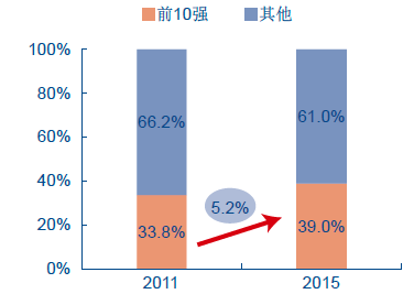 一方面行業集中度的提升,是政策導向也是伴隨企業做大做強、行業趨于成熟后的必然結果,且隨著競爭加劇以及兩票制、營改增等政策不斷的推進,小型地方性流通企業的生存空間逐步壓縮。我國醫藥流通集中度低、且地域性特點明顯,因此地方流通企業往往具備更強的終端控制力,這為在兩票制下的行業整合提供了契機。2011-2015 年,我國CR3 市占率從22.7%提升至28.6%,CR100 市占率從33.8%提升至39.0%,醫藥流通市場的并購整合態勢明顯。