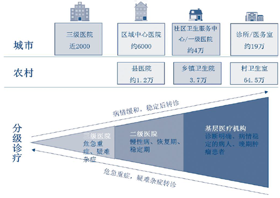 我國醫療衛生服務體系主要由三級醫院、中等規模的區域中心醫院及縣醫院以及基層醫療衛生機構組成,由于長期的資源錯配造成基層醫療機構的服務能力受限以及大型三級醫院的過載運行,看病難、看病貴問題突出。