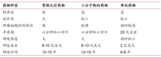 單抗藥物與常規化療藥物、小分子靶向藥物比較
