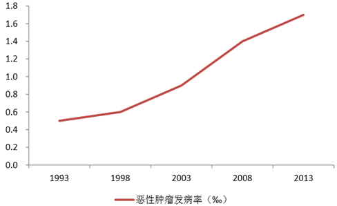 受人口老齡化、環境污染等因素影響,我國惡性腫瘤發病率逐年上升,患病人數持續增長。2015 年,我國 抗腫瘤藥物市場規模已接近 1000 億元, 2020 年則有望突破 2000 億元,市場空 間巨大。