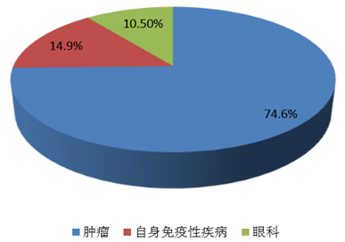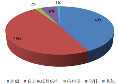 隨著時間的推移,越來越多已上市的單抗藥物表現出更大的適應性,如由 Genetech 生產的貝 伐單抗于 2004 年上市之初被批準用于治療轉移性結直腸癌,2006 年新增適應癥 非小細胞肺癌,2007 年被歐盟國家批準用于治療乳腺癌,2014 年被 FDA 批準聯合化療治療宮頸癌,此外,貝伐單抗一直以來還被醫生用來治療黃斑變性眼病(AMD)。不同于國際市場,目前國內上市單抗藥物主要應用于抗腫瘤領域,相應市場占比超過 70%。