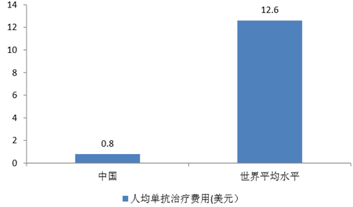 目前,國內在研單抗藥物大多為國外重磅單抗藥物的仿制藥,隨著近年國外單抗藥物專利陸續到期,我國將迎來單抗市場發展的大時代。當前, 我國人均單抗藥物治療費用約為 0.8 美元,僅約占世界人均單抗藥物治療費用的 1/16,市場發展空間巨大。