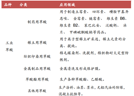 工業草酸是指達到國家標準(GB/T1626-88)的草酸,目前工業草酸為草酸行業的主 要產品,主要應用于制藥、稀土、精細化工和紡織印染等行業。精制草 酸是由工業草酸精制后生成的高純草酸,產品質量高于工業草酸國家標 準。隨著草酸應用領域不斷擴展和深化,下游客戶對草酸純度和品質的 要求不斷提高,精制草酸需求快速增長。此外,精細化工行業的發展促 進了以工業草酸和精制草酸為基礎原料的衍生產品相繼被開發出來,如 草酸鹽、草酸酯等。