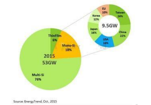 “十三五”期間,分布式光伏的大規模建設將促使單晶需求爆發。“十三五計劃”提出到 2020 年底,太陽能發電裝機容量達到 160GW,其中光伏發電總裝機容量達到150GW,地面電站 80GW,分布式 70GW。據此規劃,十三五期間分布式電站裝機量有望從 2015 年的 6.06GW 大幅提升至 70GW,具有 10 倍的增長空間。對于分布式光伏來說,單晶組件具備集約化、美觀性、高收益性等多項特點,從日本的住宅裝機市場中可以看到,其單晶組件的比例達 70%。“十三五”期間分布式光伏的巨大增長空間將進一步刺激單晶技術的大規模應用,從而對單晶產能構成極大需求。單晶市場占有率從 2014 年的 5%上升到 2015 年的 15%,預計 2016 年提高到 25%左右。