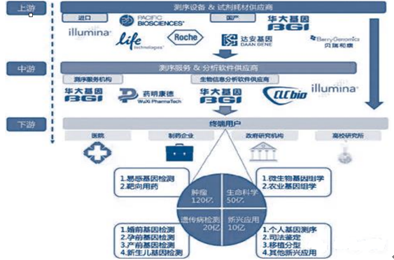 基因測序的產業鏈由上游儀器、耗材公司、中游的基因測序服務商、下游的生物信息分析公司、終端的消費群體構成。在基因測序產業鏈上,以上游設備的不斷更新換代促使測序成本不斷下降,才有了第三方測序服務的蓬勃發展,而測序服務的樣本積累是下游信息數據處理的基礎,大眾對基因測序的接受度取決于信息解讀的程度。