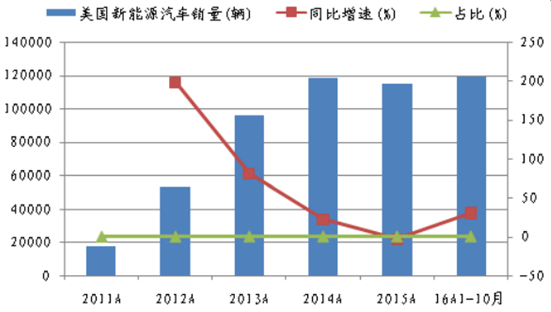 核心提示:2011-2014年,美國新能源汽車產銷量持續穩居全球龍頭,2014年銷量11.87萬輛,同比 增長22.86%,在美國汽車銷量中占比0.72%;2015年銷量11.53萬輛,同比則回落2.88%, 占比也回落至0.64%;16年1-10月2011-2014年,美國新能源汽車產銷量持續穩居全球龍頭,2014年銷量11.87萬輛,同比 增長22.86%,在美國汽車銷量中占比0.72%;2015年銷量11.53萬輛,同比則回落2.88%, 占比也回落至0.64%;16年1-10月實現銷量11.97萬輛,同比增長30.88%,占比提升至0.83%, 創近年來新高。2014年為我國新能源汽車啟動元年,全年產量8.40萬輛,在我國汽車產量中占比0.35%;15年則大幅飆增至37.90萬輛,同比增長351.19%;16年1-10月實現產量35.50 萬輛,同比增長98.10%。我國新能源汽車長期堅持以純電動為主的發展格局,16年1-10 月,純電動合計占比77.75%,且我國新能源汽車市場占比持續大幅提升,2011年占比僅 為0.04%,15年大幅提升至1.55%,16年1-10月持續提升至1.62%。