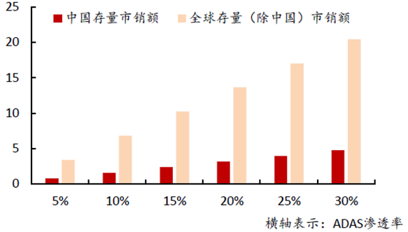 2020 年ADAS 后裝銷售額及滲透率測(cè)算(萬億元)