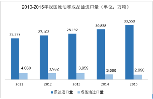 從 1993 年起,我國(guó)由原油凈出口國(guó)轉(zhuǎn)變成凈進(jìn)口國(guó)。每年國(guó)內(nèi)對(duì)原油的需求不斷增加,但國(guó)內(nèi)的原油產(chǎn)量有限,不足部分只能通過(guò)進(jìn)口解決。根據(jù)國(guó)家統(tǒng)計(jì)局?jǐn)?shù)據(jù),2015 年我國(guó)原油和成品油進(jìn)口量分別為 33,550 萬(wàn)噸和 2,990 萬(wàn)噸。
