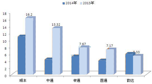 在凈利潤方面,2014年,順豐、圓通、申通、韻達和中通分別實現(xiàn)凈利潤10.9億元、4.0億元、5.2億元、5.9億元和4.3億元;2015年,順豐、圓通、申通、韻達和中通分別實現(xiàn)凈利潤16.2億元、7.17億元、7.67億元、5.33億和13.32億元。