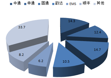 從包裹量來看,2015年中通、申通、圓通、韻達、EMS和順豐的市場份額分別為14.3%、12.4%、14.7%、10.5%、6.2%和8.2%。