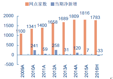 2009-2016年豫園商城老廟黃金、亞一金店網點數