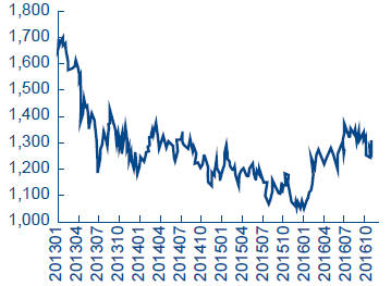 2013-2016年倫敦黃金現貨價格走勢(美元/盎司)