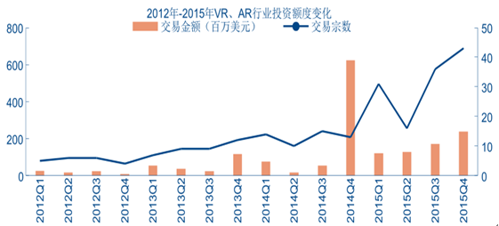 2016 年為 VR 產業元年,市場規模預計同比增長 7.7 倍。自年初起,Oculus Rift、HTCVive、Sony PS VR 和 Google Daydream VR 相繼面世,VR 產業融資再創新高。然而與硬件層的火爆相比,VR 在內容端陷入了尷尬的處境,匱乏的優質 VR 資源已經對 VR 產業的發展構成了阻礙因素,未來 VR 產業發展的源動力將逐漸由硬件過渡到內容。根據市場調查數據,2015 年 VR 產業的市場規模為 7.7 億美元,這一數字在 2016 年有望達到 50 億美元,同比增長 7.7 倍。