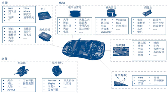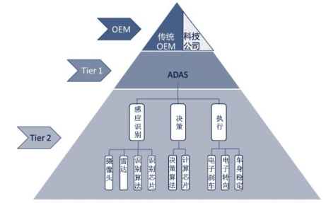 智能駕駛亦為三層金字塔供應鏈格局。1)頂端的 OEM 和科技型造車企業,傳統車企仍然掌握汽車生產資質和整車控制集成的核心競爭力,科技型公司則憑借在人工智能、人機交互方面的優勢搶占一部分市場份額;2)ADAS 供應商利用掌握的感知識別算法等為車企和科技型公司提供 ADAS 系統解決方案;3)底層零部件供應商,如雷達、攝像頭、芯片、電子剎車等。從塔頂至塔底,行業資金/技術門檻逐漸降低,對投資的資金規模要求也在下降。