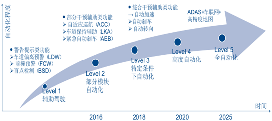 當前尚處于輔助駕駛前期,距離徹底的無人駕駛還有一定距離。美國汽車工程學會 SAE將自動駕駛分為 0 到 5 級,0 級為完全人工駕駛,5 級為徹底的無人駕駛,中間的級別為不同程度的自動駕駛或輔助駕駛。目前 L1 和 L2 技術已相對成熟。L3 和 L4 技術即將量產預計2018-2020 年實現量產。徹底的 L5 無人駕駛是指全路段、全天候的,無需人工干預的全自動駕駛,汽車可自主完成加速、制動、轉向等動作,可能需要至少十年才能達到產業化階段。中短期內,智能汽車將以智能輔助駕駛 ADAS 的形式呈現,可實現自適應巡航 ACC、車道偏離預警 LDW 等功能,可完成部分封閉區段的自動駕駛。