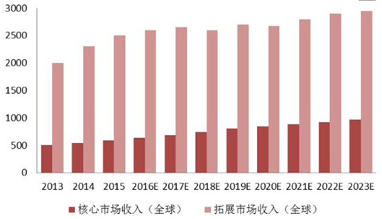 2013-2023年累計(jì)核心市場(chǎng)的收入份額