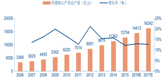 2006-2017E 年我國傳媒產(chǎn)業(yè)總產(chǎn)值及預測