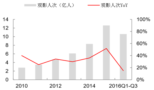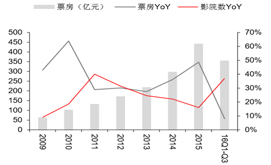 2015 年來自電商的票補資金超過 40 億元,由其撬動的票房增量約為 80 億元(以 1:1 杠桿測算),扣除票補影響后的票房內生增速為 20%。同一口徑下,按照 1-9 月票房 占比 70%-75%測算,預計2016年全年票房為 450 億元,同比增速仍然達到 20%。因此在票補退潮導致的票房回落表象之下,行業平穩增長的態勢并未發生逆轉。