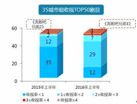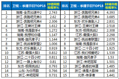 35城市網(wǎng)中,排名前15的綜藝中,浙江衛(wèi)視占8檔;東方衛(wèi)視兩檔“綜二代” 《歡樂喜劇人》和《極限挑戰(zhàn)》收視較之去年都有所提升,江蘇衛(wèi)視《最強大腦》收視也有所上漲;2016年新節(jié)目中浙江衛(wèi)視《王牌對王牌》、《二十四小時》均進入前10。