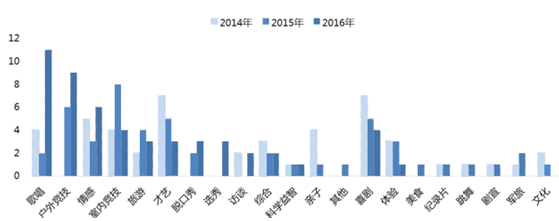戶外競技類真人秀、情感類節(jié)目、脫口秀節(jié)目數(shù)量也有不同數(shù)量的增加。而才藝類、喜劇類節(jié)目三年來數(shù)量整體下滑。