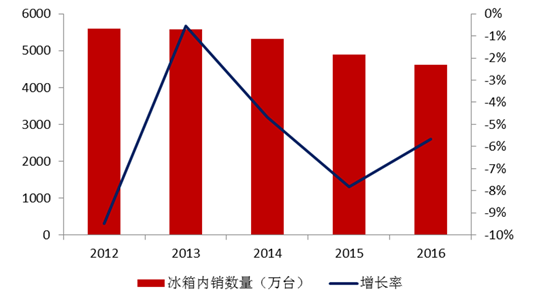 目前冰箱消費據市場調查以更新換代為主,但在經濟低迷的大環境下,更新需求能量不足。且行業推出的大型冰箱受制于中國家庭廚房面積所限,未形成換代浪潮,據統計,2015 年冰箱總產量為 7317.4 萬臺,同比下降 3%;總銷量為 7319.5 萬 臺,同比下滑 3.7%。冰箱出口 2404 萬臺,同比增長 4.6%;冰箱內銷 4916 萬臺,同比下 滑 7.2%。2016 年冰箱內銷量預計為 4618 萬臺,同比下滑 5.6%。冰箱行業一方面 市場銷量規模見頂、競爭轉向存量市場;另一方面在消費升級的大潮下產品結構也在 發生明顯的變化,表現在大容量、變頻、高效節能產品持續快速增長。500L 以上大容積冰箱和變頻產品銷量同比增長超過 10%,占整體市場的比例 達到 20%左右。由于產品結構升級的拉動,2016年我國冰箱市場銷售額增幅要好于銷 售量。從品牌格局看,海爾的優勢仍領先。