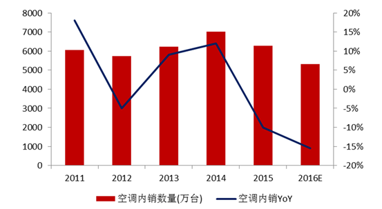 2016 年上半年國內空調市場還慘淡一片,但到下半年隨著全球高溫,國內外空 調需求大漲,加之國內房地產銷售突然火爆,空調終端銷售出現持續熱銷,家用空調 內銷市場迎來大反轉,8 月份家用空調內銷 659 萬臺,同比增長 22.9%,成為 2016 年全年的最高峰值。預計剩余 4 個月受終端銷售、房地產等利好因素影響, 家用空調內銷市場將平穩增長,但是全年下滑已成定局,2016 年家用空調內銷量預 計為 5312 萬臺,同比下滑 15.5%。