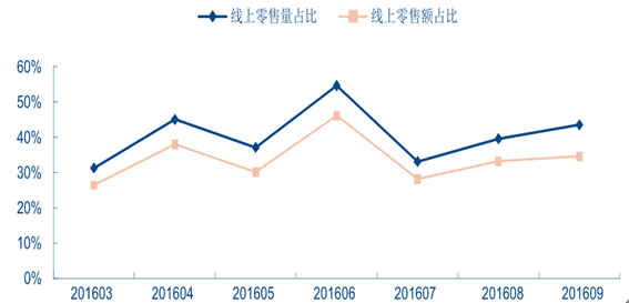 電商高速增長帶來的渠道紅利是近些年電視產業的顯著特征之一。伴隨著電商渠道的崛起,樂視、小米等專注于線上渠道銷售的品牌得以繞過傳統渠道的壁壘與封鎖,實現快速成長。但隨著線下傳統渠道的運轉效率越來越快,電商渠道的增速逐漸回歸常態,這一渠道紅利正在逐步消退。電商渠道占電視銷量比重在已接近穩態,穩定在 30~40%過 之間,偶爾因促銷超過 50% 。據2016 年上半年電視銷量數據,電商渠道占電視銷量的比重已經達到30~40%,9 月這一數字接近 45%。