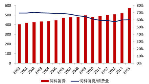 玉米的用途主要有三類:飼料、工業消費和食用。玉米富含多種牲畜、家禽生長必須的營養物質,是最重要的飼料原糧。多年來, 玉米作為飼料原糧進行消費一直占總產量的 60%上下。玉米在雞的配合飼料中,用 量高達 50%-70%。在豬料及其他飼料中所占的比例相對較少。
