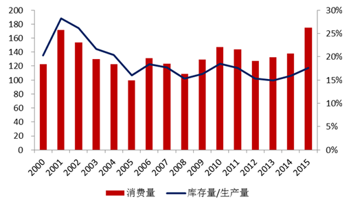 根據聯合國糧農組織的規定,糧食庫存與消費量的比例達到 17%被稱為糧食安 全系數,低于 14%則為糧食安全緊急狀態。2015 年,由于玉米產量的大幅提高,全 球玉米期末庫存量大幅提升,達到 1.75 億噸,庫存消費比站上 17%,一改 2012-2014 連續三年低于 17%的狀況。
