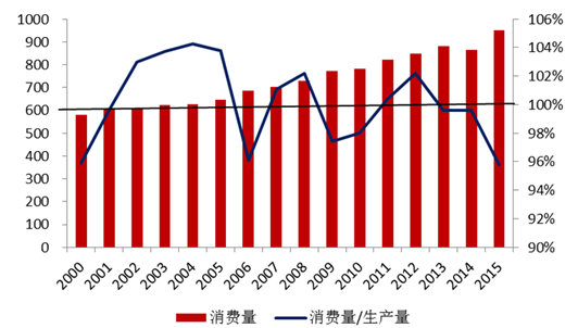 從消費端來看,全球玉米消費總量整體上保持持續增長態勢,2000-2016 年的 16 年間,有八年的時間消費量大于生產量,其他八年消費量低于生產量,消費/產量 之比最大為 2004 年,達到 104.26%,最小為 2015 年,僅有 95.76%。但從總體來 看,全球玉米產消基本平衡。