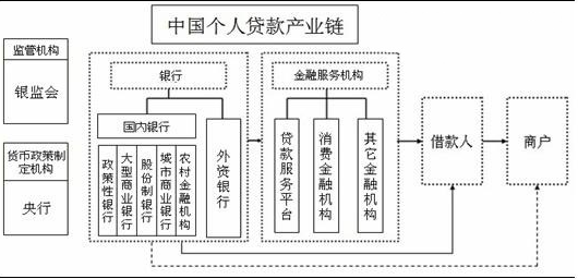 在我國,個人貸款產業鏈由銀監會(監管機構)、央行(貨幣政策制定者)、銀行、非銀行金融機構(貸款服務平臺、消費金融公司、汽車金融公司等其他金融機構)、貸款服務平臺、借款人、商戶等組成。