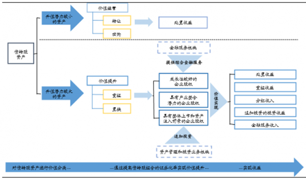 債轉(zhuǎn)股資產(chǎn)運作和處臵方式的收益主要包括在債轉(zhuǎn)股資產(chǎn)經(jīng)營和處臵過程中直接獲得的(i)分紅收益、(ii)轉(zhuǎn)讓收益、以及(iii)重組收益,此外,通過向債轉(zhuǎn)股企業(yè)提供金融服務(wù)獲得手續(xù)費及傭金收益;還通過債轉(zhuǎn)股企業(yè)與其所在當?shù)卣约捌渌P(guān)聯(lián)企業(yè)建立合作關(guān)系,為資產(chǎn)管理公司提供衍生的合作機會。債轉(zhuǎn)股不良資產(chǎn)經(jīng)營模式