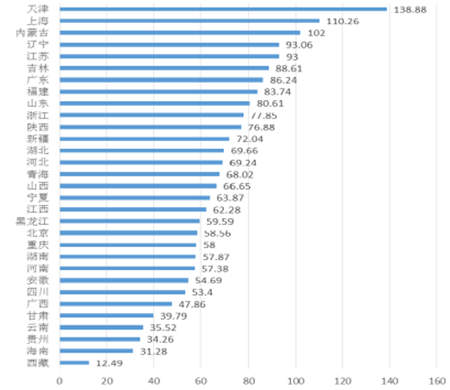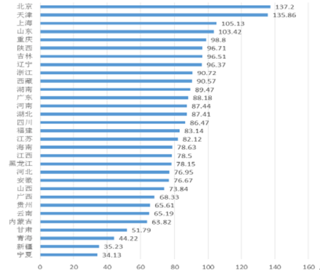 2015 年全國人均收益指數為 73.51,各省市人均收益指數情況如下圖所示。