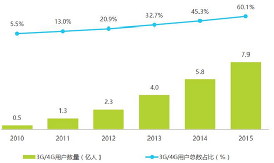 2010-2015年中國移動(3G/4G)用戶規(guī)模占比