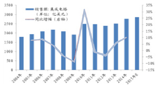 2004-2015年全球集成電路銷售額趨勢