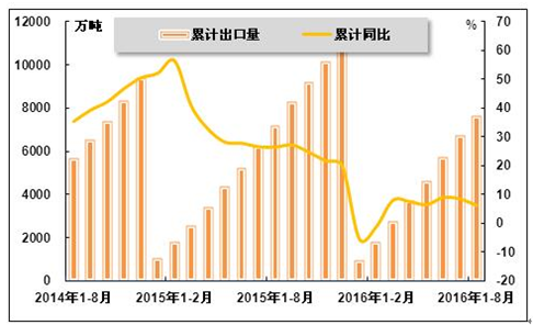 2016年8月,鋼材累計出口量同比增速繼續(xù)回落下探。海關(guān)總署數(shù)據(jù)顯示,2016年1-8月,我國累計出口鋼材6740萬噸,同比增長6.2%,增速比2016年1-7月下降2.3個百分點,比上年同期下降20.3個百分點。鋼材累計出口量呈現(xiàn)大幅下滑態(tài)勢的主要原因有兩點:一方面8月份我國鋼鐵出口遭受了來自墨西哥、南非、印度、巴西、加拿大、美國、歐盟等更多國家和地區(qū)的貿(mào)易救濟調(diào)查,外部市場環(huán)境更趨惡化;另一方面國內(nèi)鋼鐵價格持續(xù)上揚,行業(yè)回暖一定程度上削弱了國內(nèi)鋼材出口的動力。