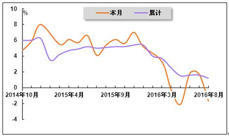 表1 2015年8月-2016年8月鋼鐵行業(yè)固定資產(chǎn)投資變化情況