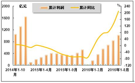 2016年8月,由于前期鋼價持續(xù)上揚、行業(yè)逐步回暖,且去年同期利潤基數(shù)較低,鋼鐵行業(yè)利潤呈現(xiàn)大幅增長態(tài)勢,同比增幅連續(xù)五個月迅猛擴大。國家統(tǒng)計局?jǐn)?shù)據(jù)顯示,2016年1-8月,鋼鐵行業(yè)累計實現(xiàn)利潤總額1,014.8億元,同比增長209.6%,增速比2016年1-7月上升78.1個百分點,而上年同期為同比下降51.6%。
