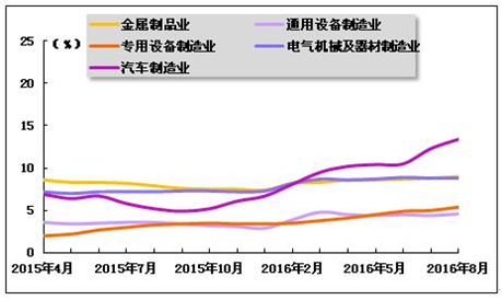 2016年8月,主要耗鋼工業(yè)生產(chǎn)快速穩(wěn)定增長,行業(yè)累計增加值增長率同比、環(huán)比均有所提升,主要耗鋼工業(yè)的用鋼需求進一步穩(wěn)定。國家統(tǒng)計局?jǐn)?shù)據(jù)顯示,2016年1-8月,金屬制品業(yè)、通用設(shè)備制造業(yè)、專用設(shè)備制造業(yè)、電氣機械及器材制造業(yè)、汽車制造業(yè)累計增加值增長率分別為9.0%、4.6%、5.4%、8.8%、13.4%,比上年同期分別上升了1.1、1.0、2.1、1.6、8.2個百分點,與2016年1-7月相比,除電氣機械及器材制造業(yè)持平外,金屬制品業(yè)、通用設(shè)備制造業(yè)、專用設(shè)備制造業(yè)、汽車制造業(yè)分別提升了0.2、0.2、0.4、1.1個百分點。