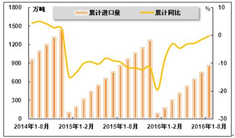 2016年8月,鋼材累計進口量繼續(xù)負(fù)增長,但同比降幅連續(xù)四個月收窄。海關(guān)總署數(shù)據(jù)顯示,2016年1-8月,我國累計進口鋼材870萬噸,同比下降0.2%,降幅比2016年1-7月和上年同期分別收窄1.2和9.4個百分點。隨著國內(nèi)鋼鐵行業(yè)逐漸回暖、市場需求逐步改善,近期我國鋼鐵累計進口增速轉(zhuǎn)正的概率不斷增大。