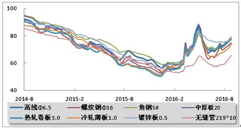 表5 2015年8月-2016年8月主要鋼材品種價格指數(shù)情況窗體頂端時間-窗體底端高線Φ6.5螺紋鋼Φ16角鋼5#中厚板20熱軋卷板2.75冷軋薄板1鍍鋅板0.5無縫管219*102015年8月末67.26368.360.857.858.363.161.82015年9月末63.96066.75856.457.361.960.12015年10月末62.159.464.856.854.455.359.858.42015年11月末58.75660.853.95152.257.5562015年12月末58.455.559.454.753.955.157.653.92016年1月末5956.660.355.955.358.159.653.22016年2月末61.459.56260.258.959.960.553.92016年3月末70.868.770.372.56969.469.9582016年4月末88.286.382.986.185.180.581.965.42016年5月末68.764.972.171.170.468.577.860.72016年6月末69.965.870.869.369.96575.357.52016年7月末72.87073.473.272.468.175.258.92016年8月末7774.879.278.177.874.177.965.8圖10 2014年8月-2016年8月主要品種鋼材價格指數(shù)走勢