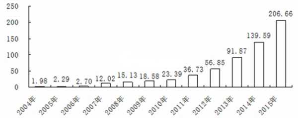 2004-2015年中國快遞服務業務增長走勢(單位:億件)