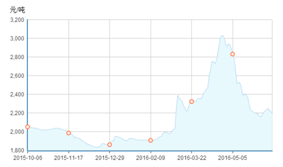 從2015年12月份到2016年春節的一段時間,庫存較上年同期下降1/4;由于2015年四季度停產企業較多,國內鋼鐵企業開工率將至低點;同期中鋼協的粗鋼日產量也逼近200萬噸,在三個因素的共同影響下,鋼鐵市場做多熱情高漲。進入三月份之后,由于國家政策力度的加強以及傳統消費旺季的因素影響,市場做多熱情進一步高漲,共同推動了三四月份鋼材價格的暴漲。