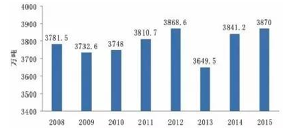 2008-2015年中國奶類產量